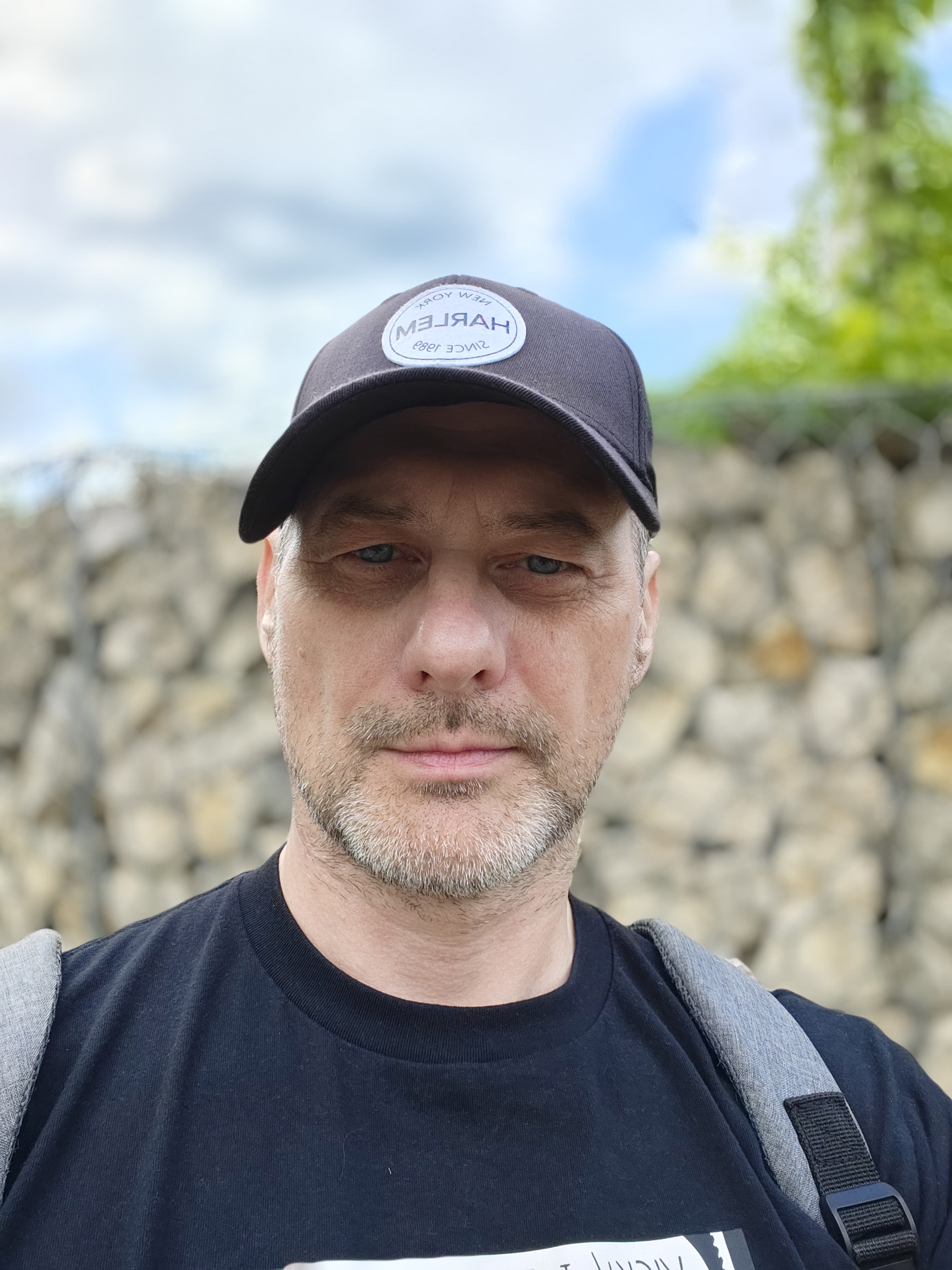 Фронтальная камера (16 Мп, 1/3,09″, 1,0 мкм, f/2,5, 25 мм) врезана в экран в верхней части посередине. Детализация у нее высокая, аккуратность обращения с контуром головы и волосами в режиме портретной съемки с имитацией боке вполне пристойная.
