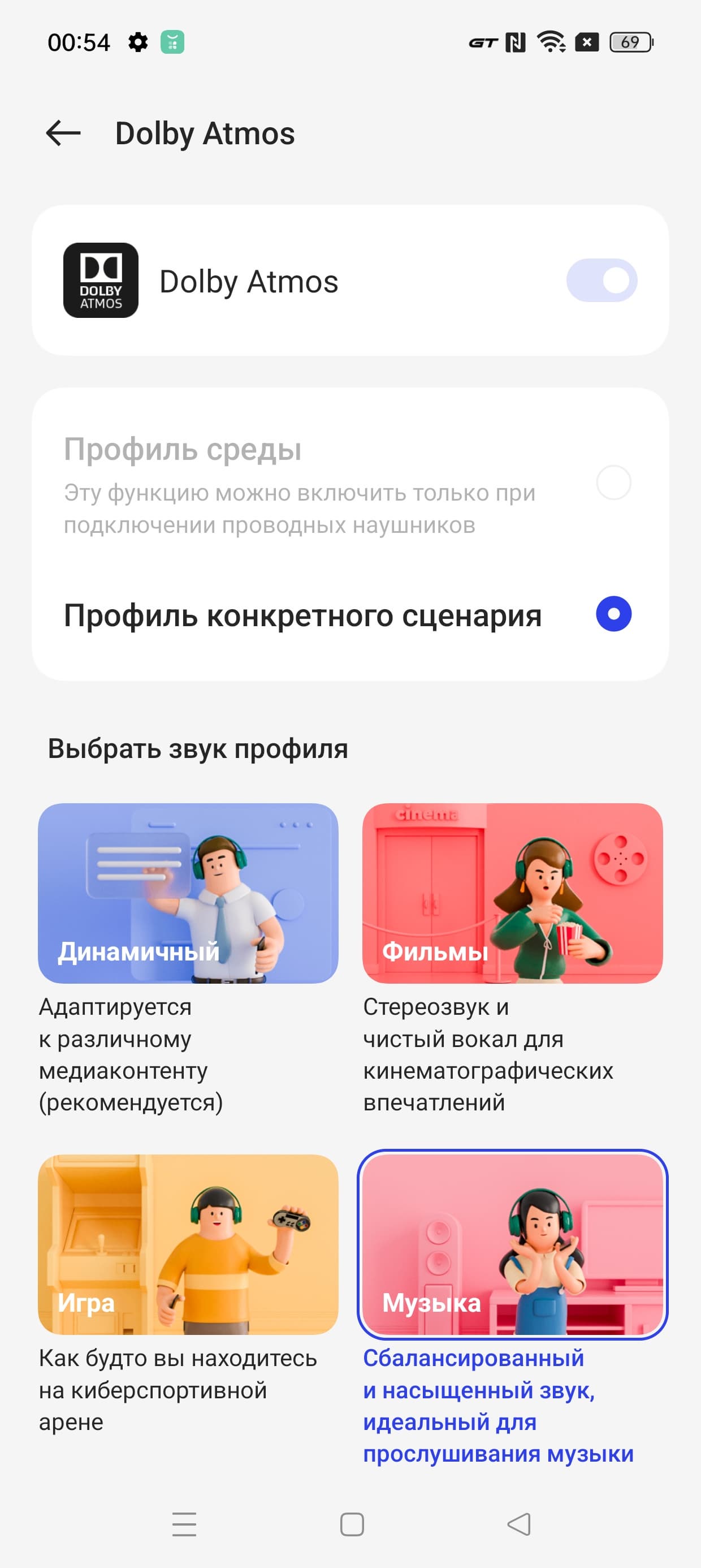 Мощные динамики выдают в стереорежиме чистый, объемный, качественный звук, с приятным на слух набором частот, включая низкие. В наушниках звук тоже весьма достойный, есть регулировки с пресетами системы Dolby Atmos. Современный Bluetooth 5.3 поддерживает кодеки A2DP, LE, aptX HD. Нет только выхода 3,5 мм для качественных проводных наушников.