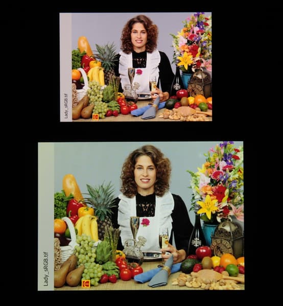 Цвета на экране Realme GT3 перенасыщены (обратите внимание на помидоры, бананы, салфетку и оттенок лица), а цветовой баланс заметно отличается. Напомним, что фотография не может служить надежным источником сведений о качестве цветопередачи и приводится только для условной наглядной иллюстрации. В частности, выраженный красноватый оттенок белого и серого полей, присутствующий на фотографиях экрана Realme GT3, при перпендикулярном взгляде визуально отсутствует, что подтверждается аппаратными тестами с помощью спектрофотометра. Причина в том, что спектральная чувствительность матрицы фотоаппарата неточно совпадает с этой характеристикой человеческого зрения.