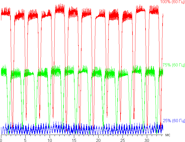 На высоком и среднем уровне яркости присутствует значимая модуляция с частотой примерно 360 или 432 Гц. На рисунке ниже приведены зависимости яркости (вертикальная ось) от времени (горизонтальная ось) для нескольких значений настройки яркости. Сначала для режима с частотой обновления 60 Гц:
