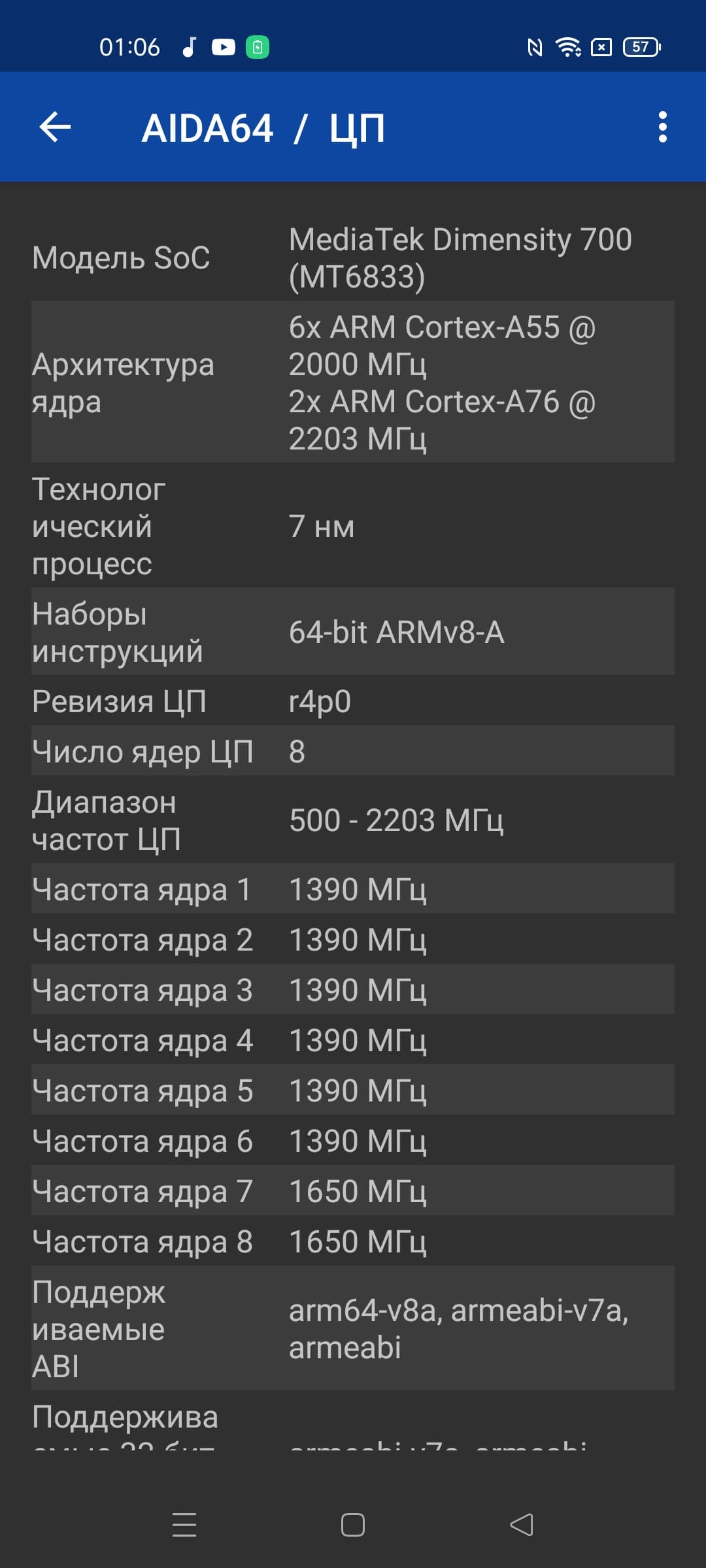 - SoC MediaTek MT6833 Dimensity 700 5G, 8 процессорных ядер (2×Cortex-A76 @2,2 ГГц + 6×Cortex-A55 @2,0 ГГц)