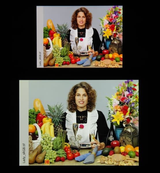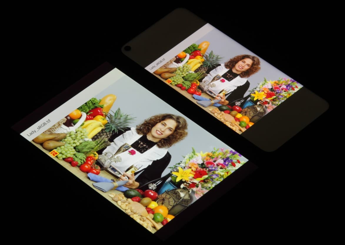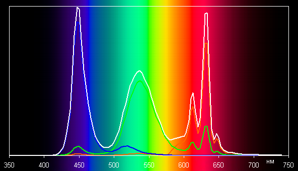 Спектры компонент достаточно хорошо разделены, что и обуславливает широкий цветовой охват. Для потребительского устройства широкий цветовой охват является недостатком, поскольку в итоге цвета изображений — рисунков, фотографий и фильмов, — ориентированных на пространство sRGB (а таких подавляющее большинство), имеют неестественную насыщенность. Особенно это заметно на узнаваемых оттенках, например на оттенках кожи. Результат приведен на фотографиях выше. Впрочем, не все так плохо: при выборе профиля Нежность охват сжимается до границ sRGB.