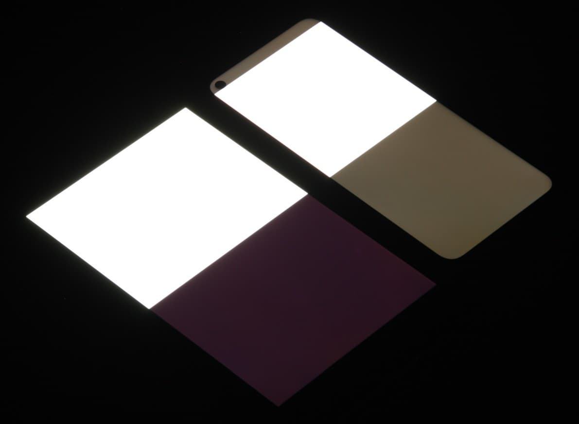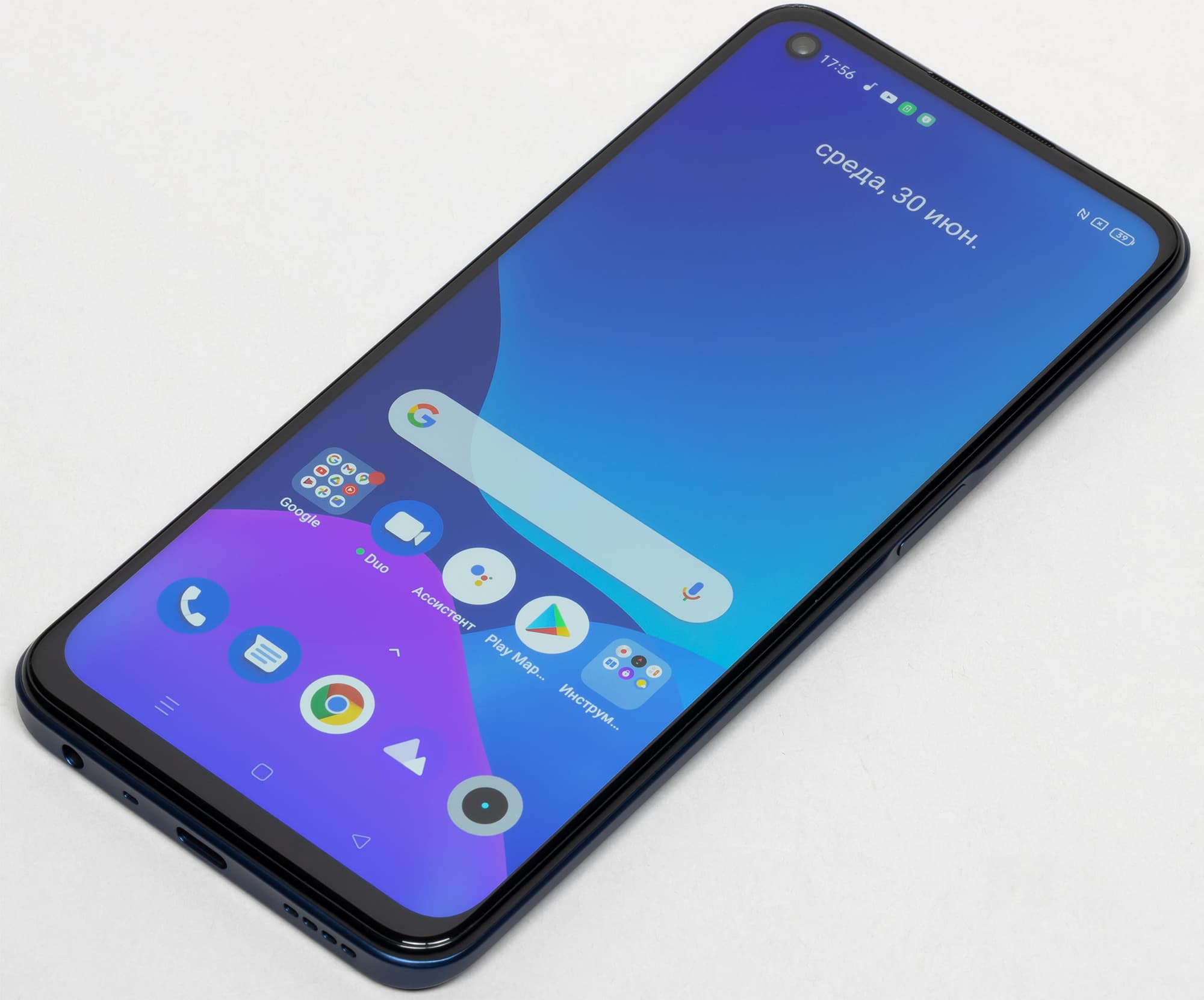 Экран у Realme Narzo 30 5G заметно темнее (яркость по фотографиям 102 против 110 у Nexus 7). Двоение отраженных объектов в экране Realme Narzo 30 5G очень слабое, это свидетельствует о том, что между слоями экрана (конкретнее между внешним стеклом и поверхностью ЖК-матрицы) нет воздушного промежутка (экран типа OGS — One Glass Solution). За счет меньшего числа границ (типа стекло/воздух) с сильно различающимися коэффициентами преломления такие экраны лучше смотрятся в условиях интенсивной внешней засветки, но вот их ремонт в случае потрескавшегося внешнего стекла обходится гораздо дороже, так как менять приходится экран целиком. На внешней поверхности экрана есть специальное олеофобное (жироотталкивающее) покрытие, которое по эффективности примерно как у видавшего виды Nexus 7, что по современным меркам весьма средне. Но все равно следы от пальцев удаляются существенно легче, а появляются с меньшей скоростью, чем в случае обычного стекла.