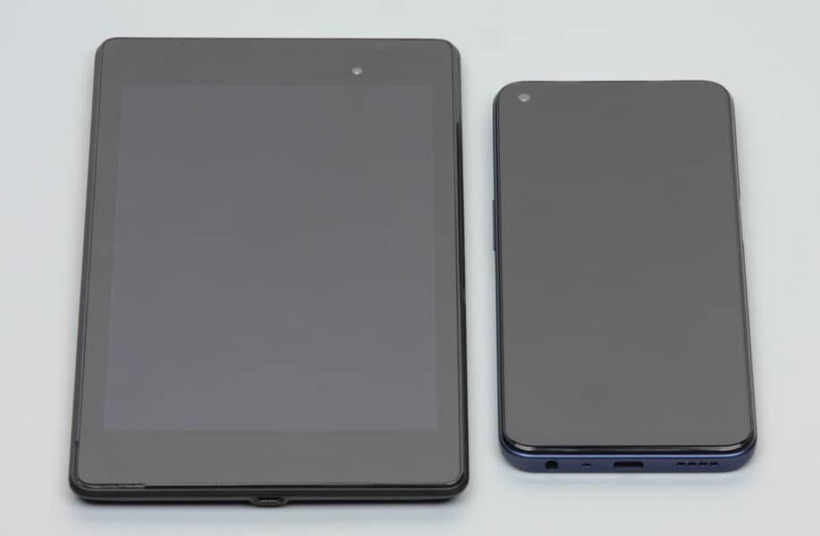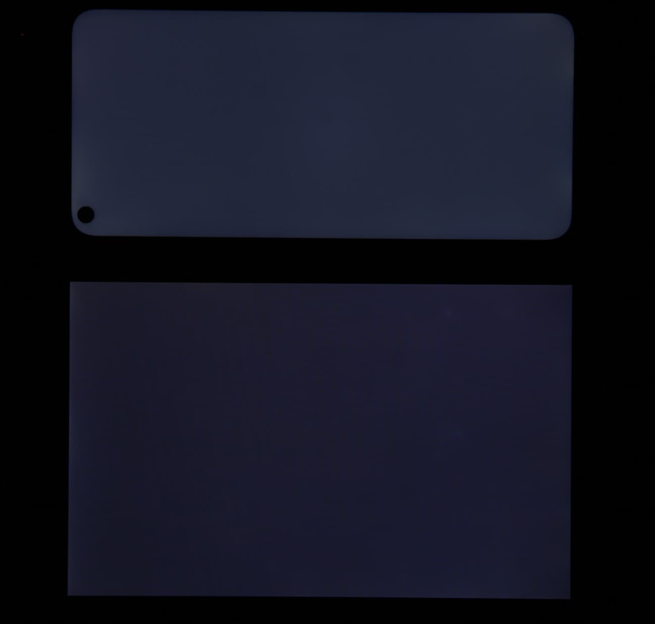 Лицевая поверхность экрана выполнена в виде стеклянной пластины с зеркально-гладкой поверхностью, устойчивой к появлению царапин. Судя по отражению объектов, антибликовые свойства экрана лучше, чем у экрана Google Nexus 7 (2013) (далее просто Nexus 7). Для наглядности приведем фотографию, на которой в выключенных экранах отражается белая поверхность (слева — Nexus 7, справа — Realme Narzo 30 5G, далее их можно различать по размеру):