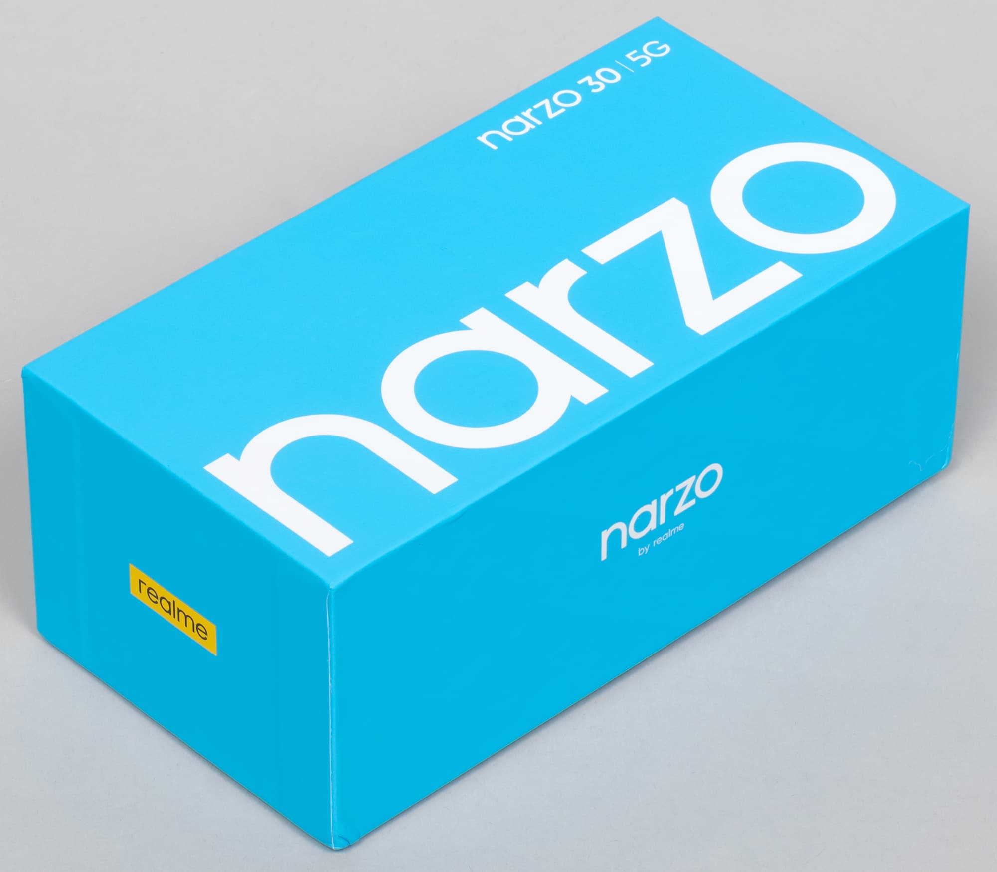 Realme Narzo 30 5G поставляется в стильно оформленной коробке из твердого картона без аляповатости и разноцветия. Видно, что компания провела ребрендинг, добавив новых цветов в свою палитру. Вышло весьма симпатично.