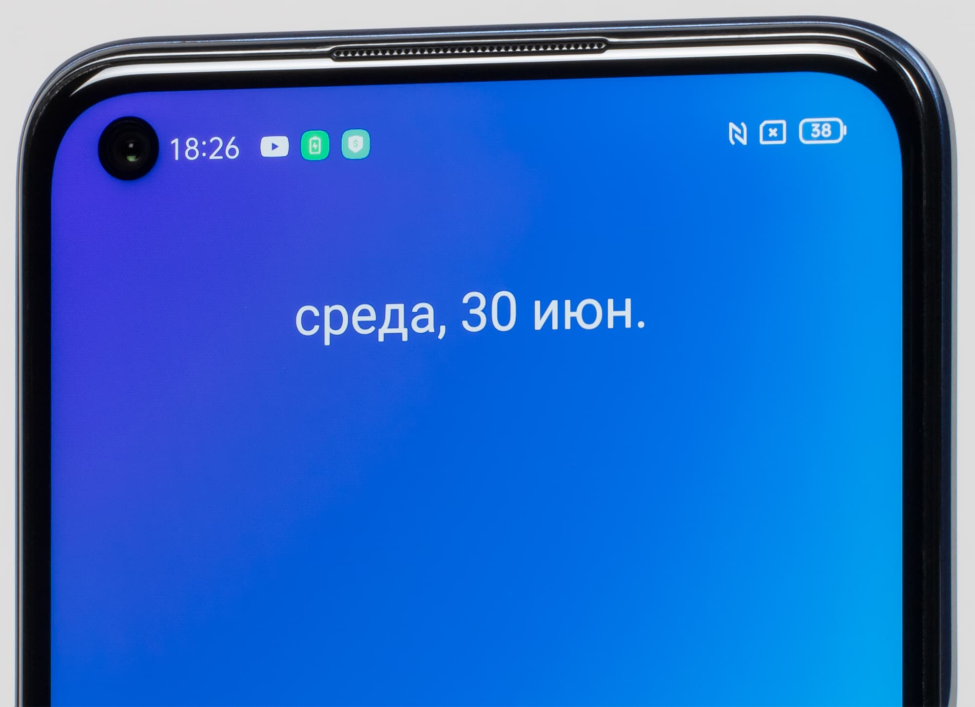 Фронтальная камера спрятана за круглым вырезом в матрице экрана, расположенным не по центру, а в углу. Это куда лучше, чем по центру: не маячит перед глазами и визуально экономит больше места. Жаль, что отсутствует светодиодный индикатор событий.