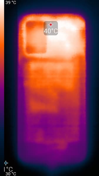Нагрев больше в верхней части аппарата, что, видимо, соответствует расположению микросхемы SoC. По данным теплокамеры, максимальный нагрев составил 40 градусов (при температуре окружающего воздуха в 24 градуса), это средний нагрев в данном тесте для современных смартфонов.