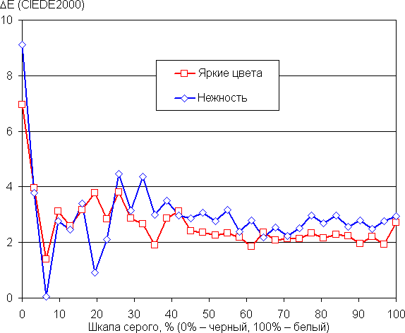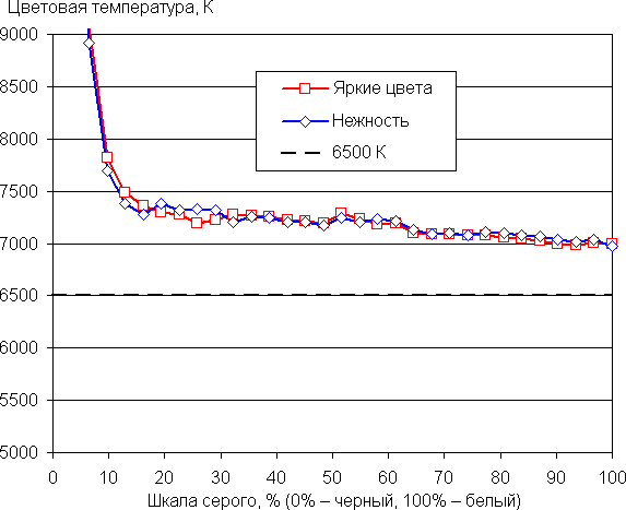 Однако после коррекции цветовой охват волшебным образом сбрасывается на широкий, независимо от значения настройки Цветовой режим экрана. И наоборот, при выборе профиля цветового охвата настройка Цветовая температура экрана сбрасывается на значение по умолчанию. В итоге нельзя получить как правильный цветовой охват, так и цветовую температуру, приближенную к стандартным 6500 К. Впрочем, не все так плохо, так как даже по умолчанию цветовая температура не сильно выше стандартных 6500 К, а отклонение от спектра абсолютно черного тела (ΔE) остается ниже 10, что для потребительского устройства считается приемлемым показателем. При этом цветовая температура и ΔE мало изменяются от оттенка к оттенку — это положительно сказывается на визуальной оценке цветового баланса. (Самые темные области шкалы серого можно не учитывать, так как там баланс цветов не имеет большого значения, да и погрешность измерений цветовых характеристик на низкой яркости большая.)