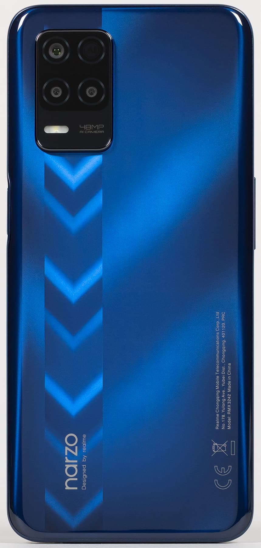 Realme Narzo 30 5G оформлен стандартно, но при этом не лишен изюминки в виде ставшей уже фирменной «фишечкой» полоски, украшающей заднюю спинку. В данном случае она имеет переливающийся геометрический узор в виде стрелок. Сам корпус пластиковый и лакированный, но боковая рамка матовая, не маркая и не скользкая.