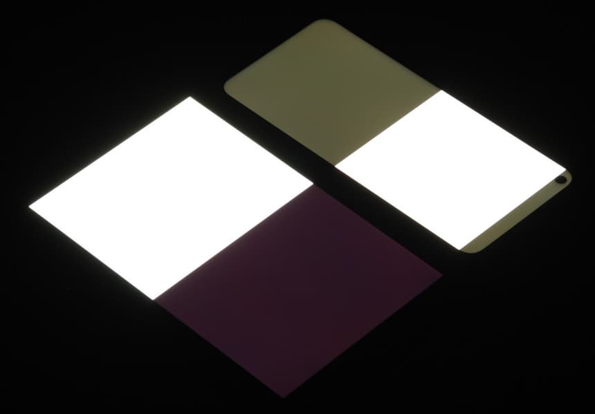 Яркость под углом у экранов уменьшилась (как минимум в 5 раз, исходя из разницы в выдержке), и уменьшилась примерно одинаково. Черное поле при отклонении по диагонали высветляется сильно, но остается условно нейтрально-серым (так это воспринимают глаза). Фотографии ниже это демонстрируют (яркость белых участков в перпендикулярном плоскости экранов направлении одинаковая!):