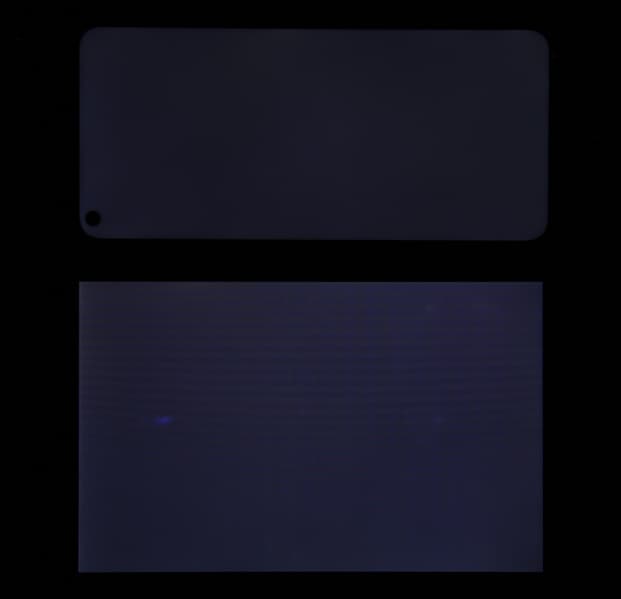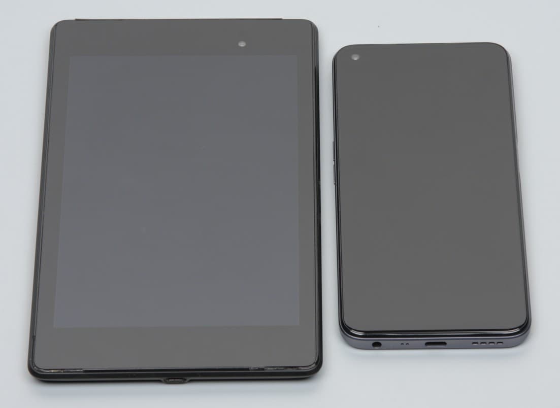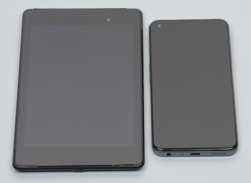 Лицевая поверхность экрана выполнена в виде стеклянной пластины с зеркально-гладкой поверхностью, устойчивой к появлению царапин. Судя по отражению объектов, антибликовые свойства экрана лучше, чем у экрана Google Nexus 7 (2013) (далее просто Nexus 7). Для наглядности приведем фотографию, на которой в выключенных экранах отражается белая поверхность (слева — Nexus 7, справа — Realme Narzo 50, далее их можно различать по размеру):