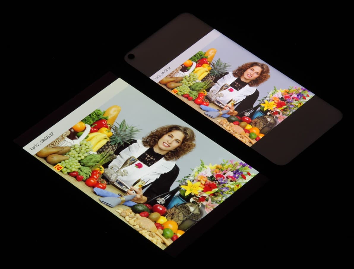 Экран имеет хорошие углы обзора без значительного сдвига цветов даже при больших отклонениях взгляда от перпендикуляра к экрану и без инвертирования оттенков. Для сравнения приведем фотографии, на которых на экраны Realme Narzo 50 и Nexus 7 выведены одинаковые изображения, при этом яркость экранов изначально установлена примерно на 200 кд/м², а цветовой баланс на фотоаппарате принудительно переключен на 6500 К.