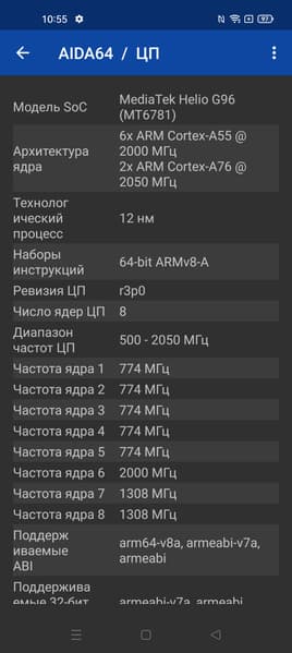 - SoC Mediatek Helio G96, 8 процессорных ядер (2×Cortex-A76 @2,05 ГГц + 6×Cortex-A55 @2,0 ГГц)