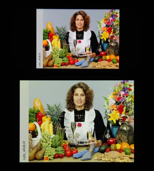 Спектры компонент достаточно хорошо разделены, что и обуславливает широкий цветовой охват. Для потребительского устройства широкий цветовой охват является недостатком, поскольку в итоге цвета изображений — рисунков, фотографий и фильмов, — ориентированных на пространство sRGB (а таких подавляющее большинство), имеют неестественную насыщенность. Особенно это заметно на узнаваемых оттенках, например на оттенках кожи. Результат приведен на фотографиях выше. Впрочем, не все так плохо: при выборе профиля Нежность охват сжимается до границ sRGB.