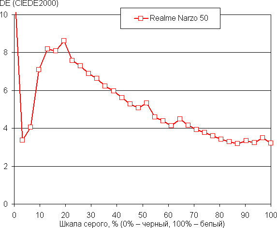 К сожалению, при выборе профиля Нежность, в котором цвета естественные, регулировки оттенка приводит к сбросу коррекции цветового охвата. Впрочем, отклонение от спектра абсолютно черного тела (ΔE) на шкале серого остается ниже 10, что для потребительского устройства считается приемлемым показателем. При этом хотя бы цветовая температура на большей части шкалы серого мало изменяется от оттенка к оттенку — это положительно сказывается на визуальной оценке цветового баланса. (Самые темные области шкалы серого можно не учитывать, так как там баланс цветов не имеет большого значения, да и погрешность измерений цветовых характеристик на низкой яркости большая.)