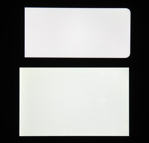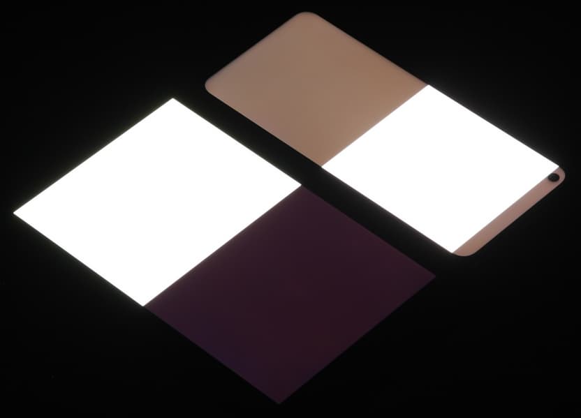 Яркость под углом у экранов уменьшилась (как минимум в 5 раз, исходя из разницы в выдержке), но у смартфона снижение яркости чуть меньше. Черное поле при отклонении по диагонали высветляется сильно, но остается условно нейтрально-серым (так видно глазами). Фотографии ниже это демонстрируют (яркость белых участков в перпендикулярном плоскости экранов направлении одинаковая!):