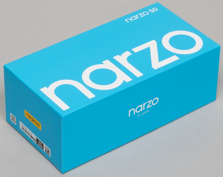 Realme Narzo 50 поставляется в твердой картонной упаковке с оформлением не в привычном ярко-желтом цвете основного бренда, а в спокойном голубом цвете с белым шрифтом серии Narzo.