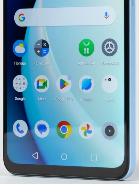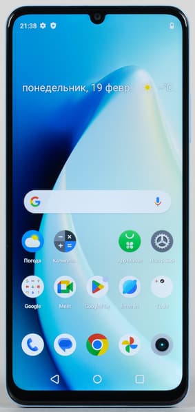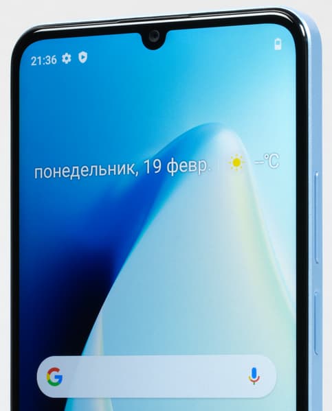 Передняя панель выдает бюджетный уровень: фронтальная камера установлена в старомодном «каплевидном» вырезе экрана.