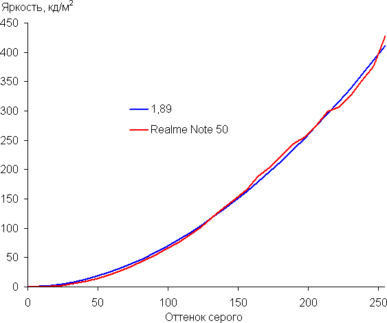 Контрастность (примерно в центре экрана) высокая — порядка 1600:1. Время отклика при переходе черный-белый-черный равно 23 мс (12 мс вкл. + 11 мс выкл.). Переход между полутонами серого 25% и 75% (по численному значению цвета) и обратно в сумме занимает 34 мс. Построенная по 32 точкам с равным интервалом по численному значению оттенка серого гамма-кривая не выявила завала ни в светах, ни в тенях. Показатель аппроксимирующей степенной функции равен 1,89, что ниже стандартного значения 2,2. При этом реальная гамма-кривая несколько отклоняется от степенной зависимости: