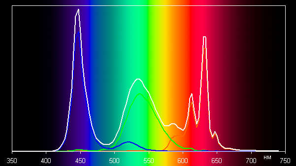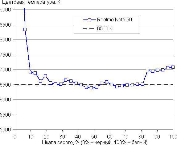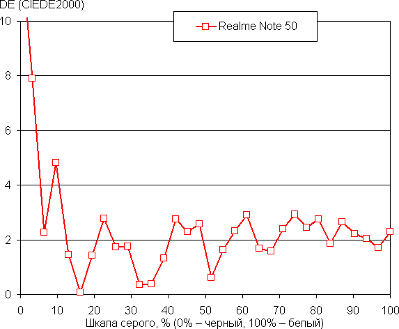 В этом устройстве есть возможность скорректировать цветовой баланс с помощью регулировки оттенка на цветовом круге или просто выбором одного из трех предустановленных профилей. К сожалению, при выборе профиля Нежность, эти настройки заблокированы. Баланс оттенков на шкале серого после выбора профиля Яркие цвета и ручной коррекции цветового баланса (точка на круге коррекции — как на снимке выше) приемлемый, так как цветовая температура близка к стандартным 6500 К (без коррекции — около 8300 К на белом поле), и отклонение от спектра абсолютно черного тела (ΔE) ниже 10, что для потребительского устройства считается приемлемым показателем. При этом цветовая температура и ΔE мало изменяются от оттенка к оттенку — это положительно сказывается на визуальной оценке цветового баланса. (Самые темные области шкалы серого можно не учитывать, так как там баланс цветов не имеет большого значения, да и погрешность измерений цветовых характеристик на низкой яркости большая.)