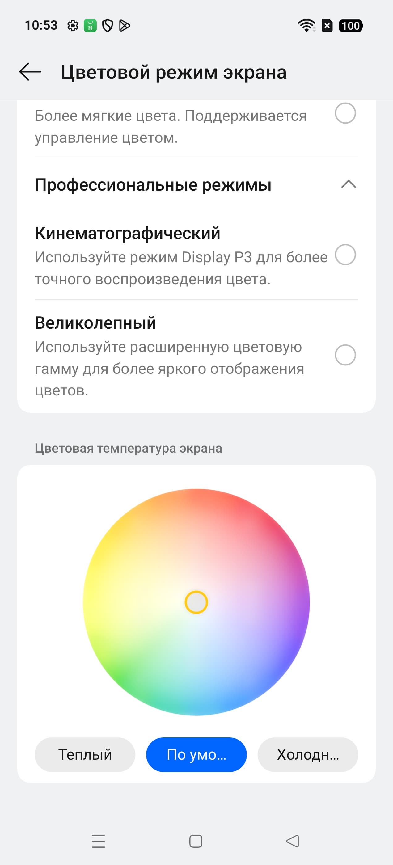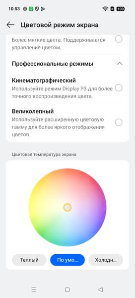 Во всех профилях есть возможность скорректировать цветовой баланс с помощью выбора профиля цветовой температуры или регулировки оттенка на цветовом круге.