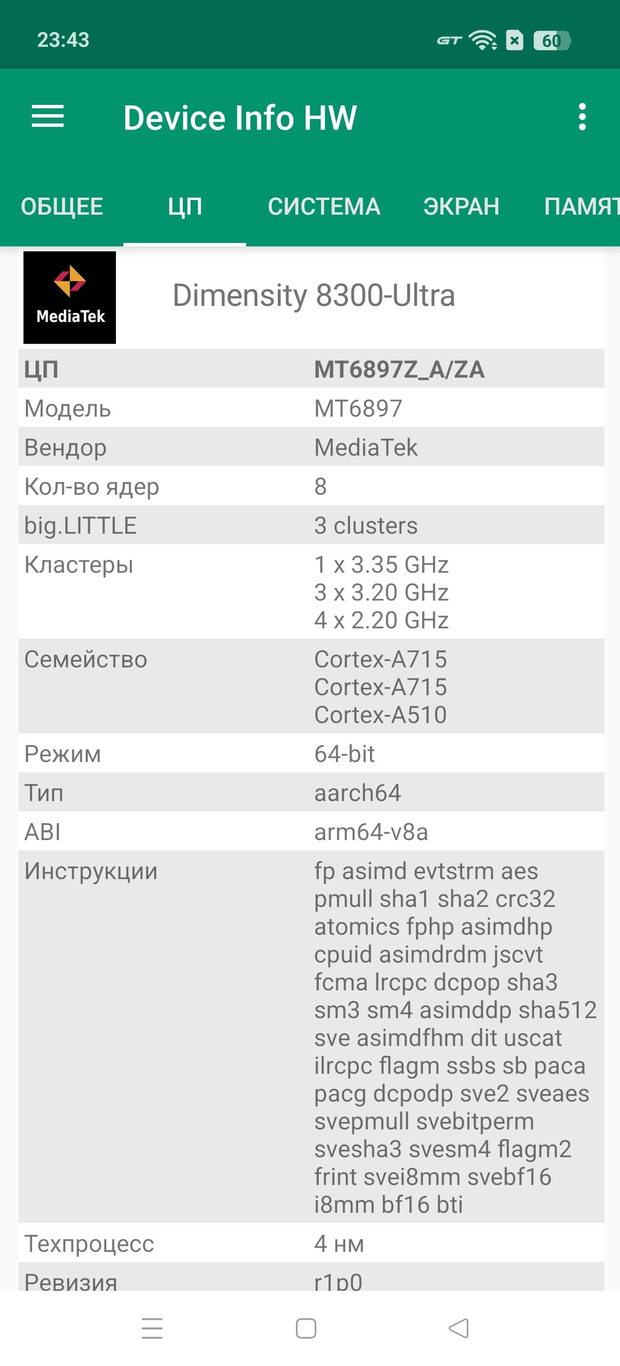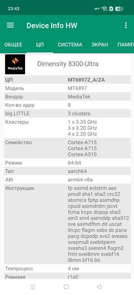 - SoC Mediatek Dimensity 8350 Ultra, 8 процессорных ядер (1×Cortex-A715 @3,35 ГГц + 3×Cortex-A715 @3,20 ГГц + 4×Cortex-A510 @2,20 ГГц)