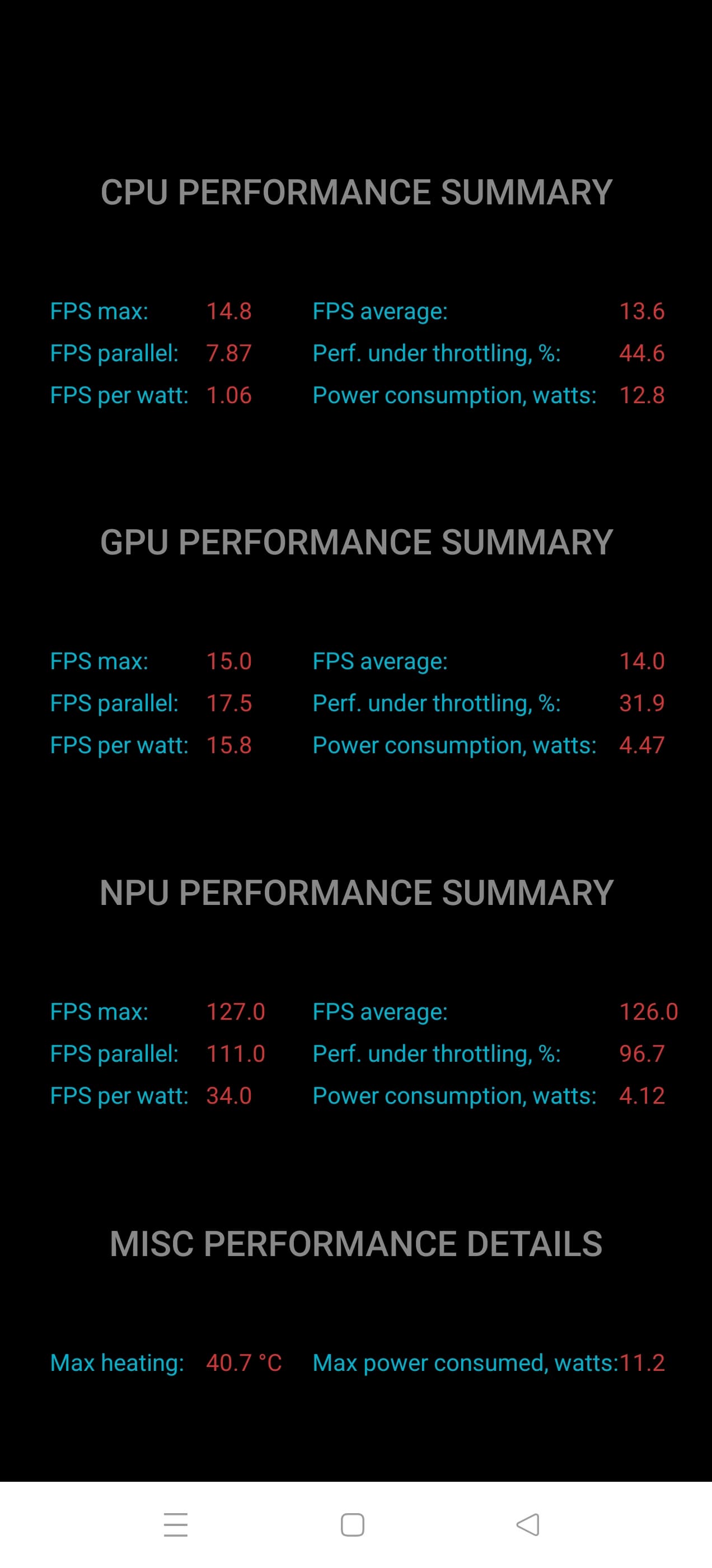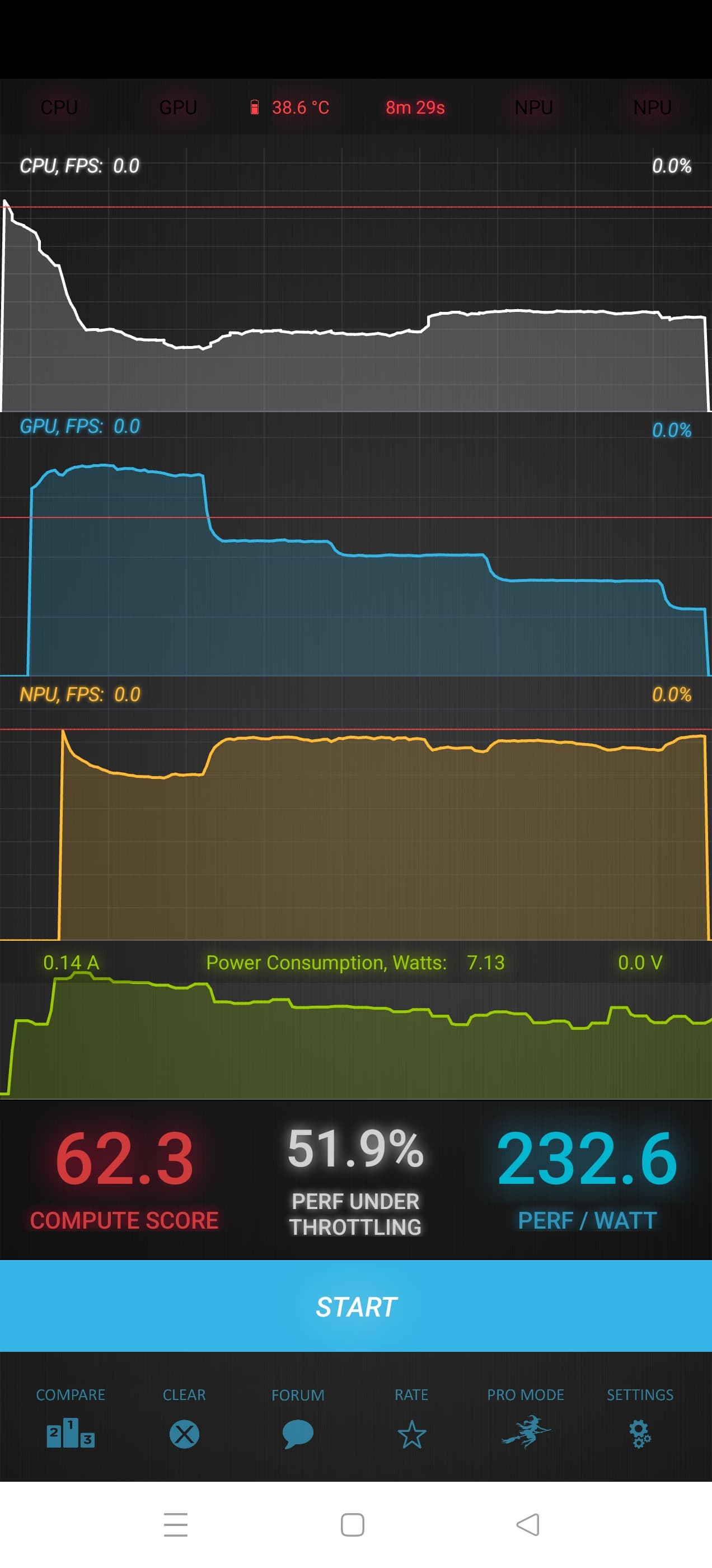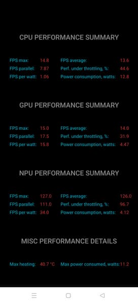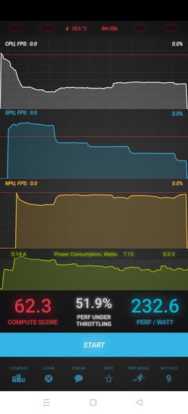 Тест на снижение производительности при нагреве мы проводим с помощью программы Burnout Benchmark, которая позволяет нагружать CPU, GPU и NPU. Видно, что снижение ступенчатое, но в итоге серьезное.