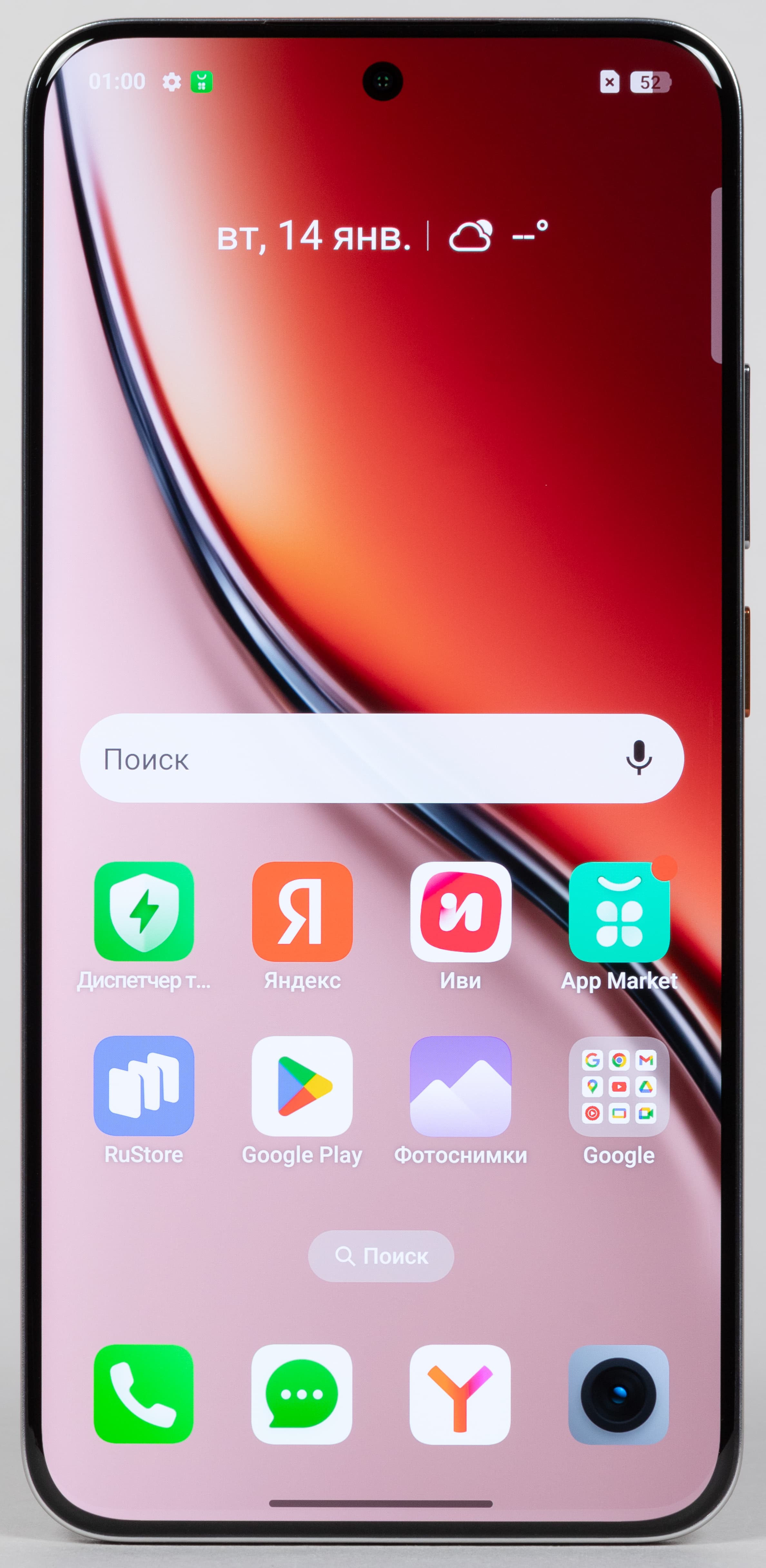 Цвета на экране смартфона перенасыщены (обратите внимание на помидоры, бананы, салфетку и оттенок лица), а цветовой баланс заметно отличается. Напомним, что фотография не может служить надежным источником сведений о качестве цветопередачи и приводится только для условной наглядной иллюстрации. В частности, выраженный красноватый оттенок белого и серого полей, присутствующий на фотографиях экрана смартфона, при перпендикулярном взгляде визуально отсутствует, что подтверждается аппаратными тестами с помощью спектрофотометра. Причина в том, что спектральная чувствительность матрицы фотоаппарата неточно совпадает с этой характеристикой человеческого зрения.
