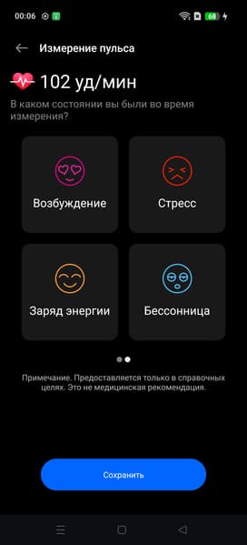 Также в смартфоне есть функции измерения пульса. Правда, она возложена не на специальный датчик, а сканер отпечатка пальца под стеклом экрана, и он не измеряет сатурацию (насыщенность крови кислородом) — только пульс.