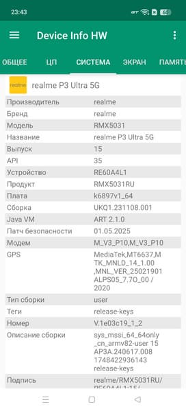 В качестве программной оболочки в Realme P3 Ultra используется ОС Android 15 с фирменным интерфейсом Realme UI 6.0. Интерфейс работает плавно и быстро, настроек — максимальное количество, как и всевозможных всплывающих дополнительных панелей. Верхняя шторка в оболочке Realme не разделена на две части в зависимости от места оттягивания. Она единая, телескопическая, как это было раньше везде (но теперь это большая редкость). Кому-то это может показаться важным фактором. Имеется полная поддержка сервисов Google и магазин Google Play Store. Рекламы нет, но предустановленных приложений много.