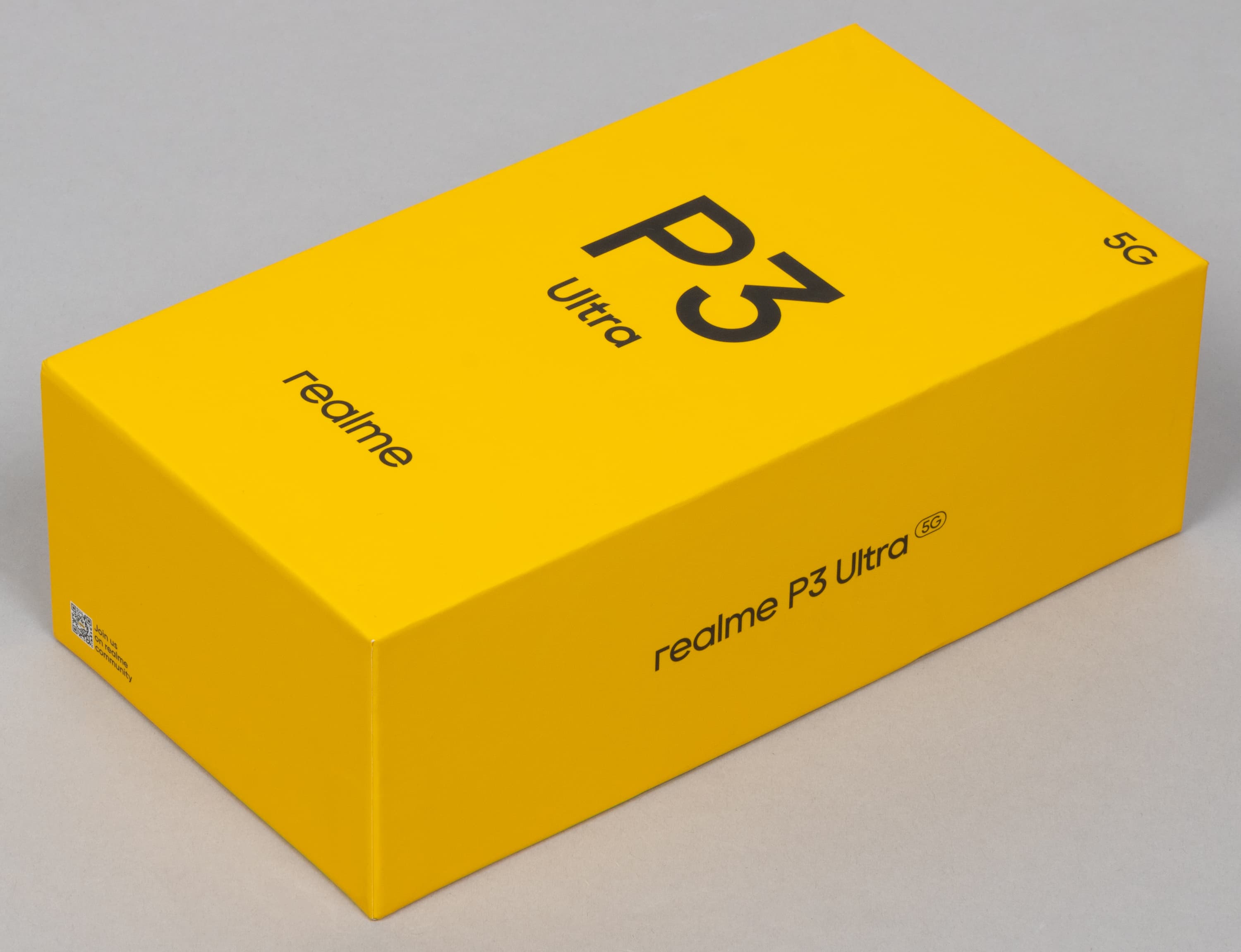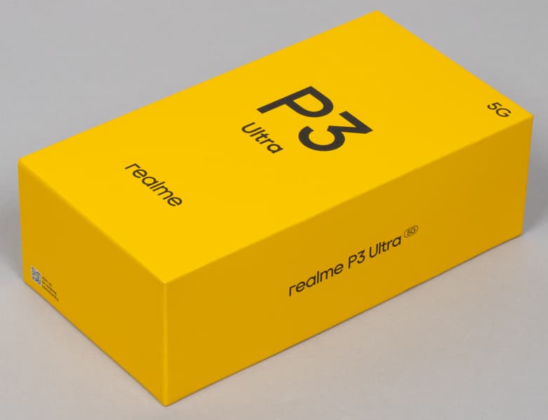 Realme P3 Ultra поставляется в картонной коробке стандартной формы, оформленной в фирменных цветах бренда.