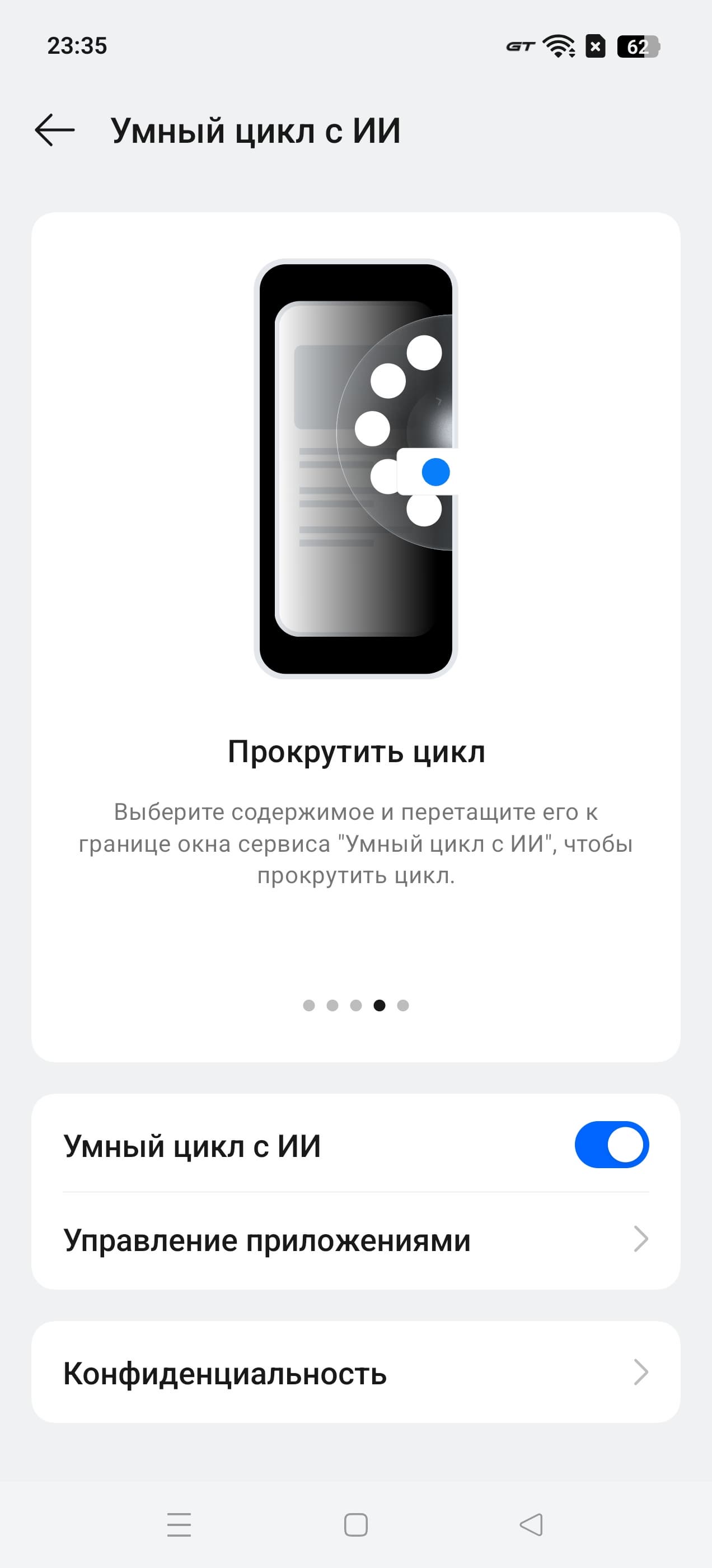 В актуальных версиях интерфейс Realme UI щедро приправлен удобными функциями ИИ: есть возможность перевода телефонных разговоров «на лету», расшифровка аудиозаписей в текст, и, конечно же, можно дорабатывать фотографии — например, избавиться от нежелательных объектов на них. Все ИИ-функции у Realme объединены в единый раздел под названием «Умный цикл с ИИ».