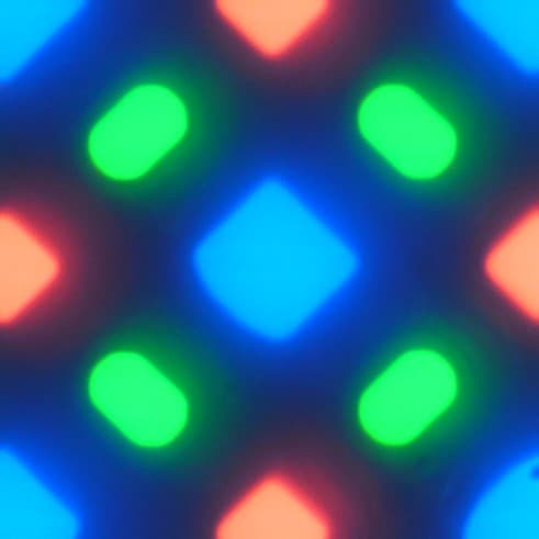 В этом экране используется матрица Super AMOLED — активная матрица на органических светодиодах. Полноцветное изображение создается с помощью субпикселей трех цветов — красного (R), зеленого (G) и синего (B), но красных и синих субпикселей в два раза меньше, что можно обозначить как RGBG. Это подтверждается фрагментом микрофотографии:
