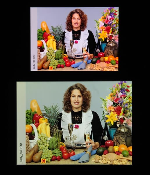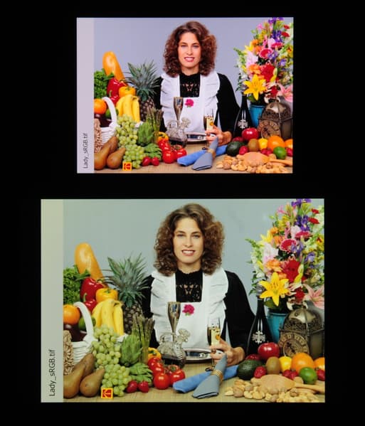 В случае изображения с профилем sRGB (или без профиля) при выбранном профиле Естественный при выводе в ПО Фотоснимки цветовой охват близок к DCI-P3 (но должен быть sRGB):