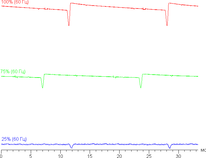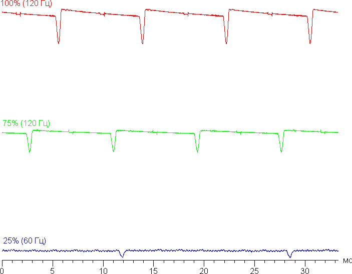 На любом уровне яркости присутствует значимая модуляция с частотой 60 или 120 Гц. На рисунке ниже приведены зависимости яркости (вертикальная ось) от времени (горизонтальная ось) для нескольких значений настройки яркости. Сначала для режима с частотой обновления 60 Гц: