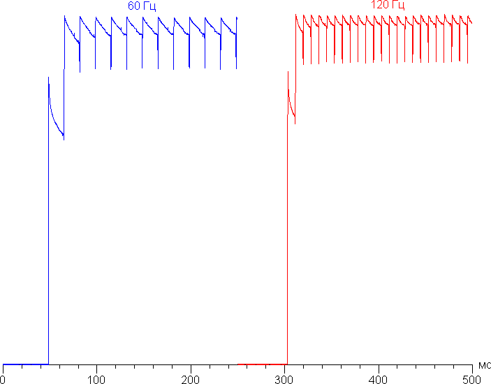 Переключение состояния элементов матрицы выполняется практически мгновенно, но на фронте включения может присутствовать ступенька шириной примерно 17 мс (что соответствует частоте обновления экрана примерно в 60 Гц) или примерно 8 мс (120 Гц). Например, так выглядит зависимость яркости от времени при переходе от черного к белому (режим 60 Гц и 120 Гц):