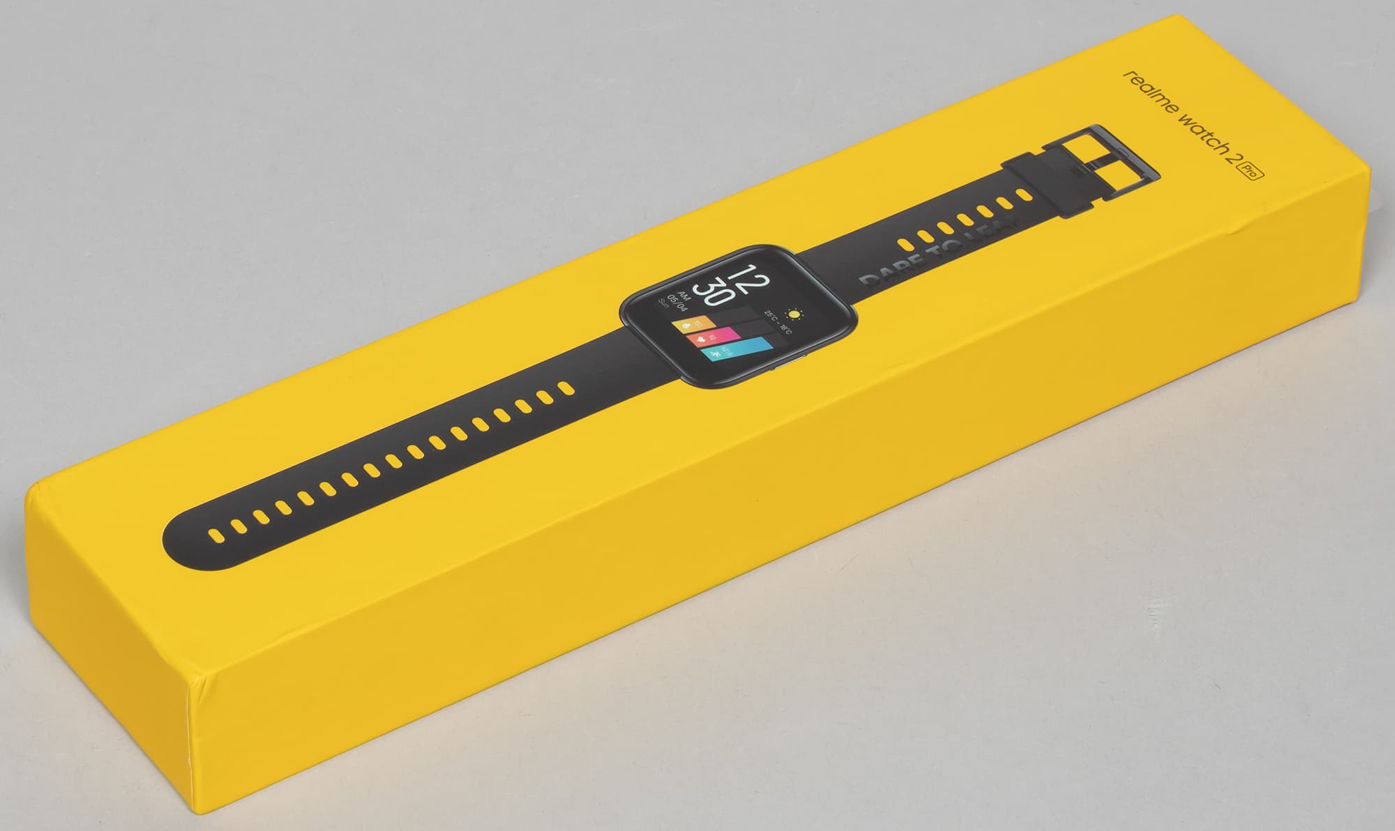 Часы поставляются в коробке весьма необычного, ярко-желтого цвета. Это фирменный цвет компании, точно так же выглядела и упаковка предыдущих умных часов, которые мы тестировали, а также смартфонов Realme.