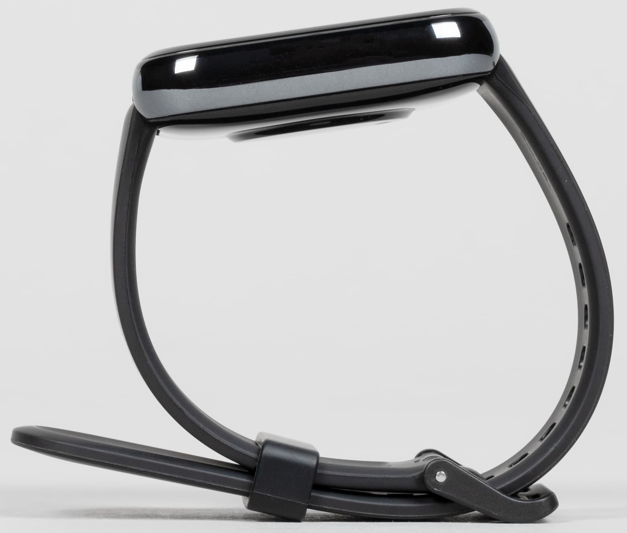 Комплектный ремешок — черный силиконовый, с достаточным количеством отверстий даже для самой худой руки. Застежка — стандартная, металлическая. Крепление половинок ремешка к корпусу — тоже стандартное, на спицах с рычажком. Это значит, что нет проблем заказать через интернет ремешки на свой вкус у любых производителей.