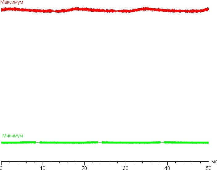 По крайней мере, на двух уровнях яркости значимая модуляция подсветки отсутствует, поэтому нет и никакого мерцания. График зависимости яркости (вертикальная ось) от времени (горизонтальная ось) для двух уровней яркости при выводе белого поля в режиме фонарика: