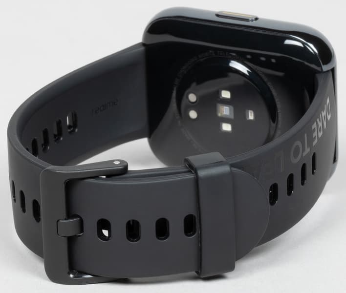 На тыльной стороне расположены контакты для подключения зарядного устройства и датчики — сердечного ритма и количества кислорода в крови. Материал поверхности — пластик, а не металл, что, в общем-то, логично и привычно. Расположение датчиков не изменилось по сравнению с самыми первыми Realme Watch. Ниже на фото — новая модель, а затем — старая.