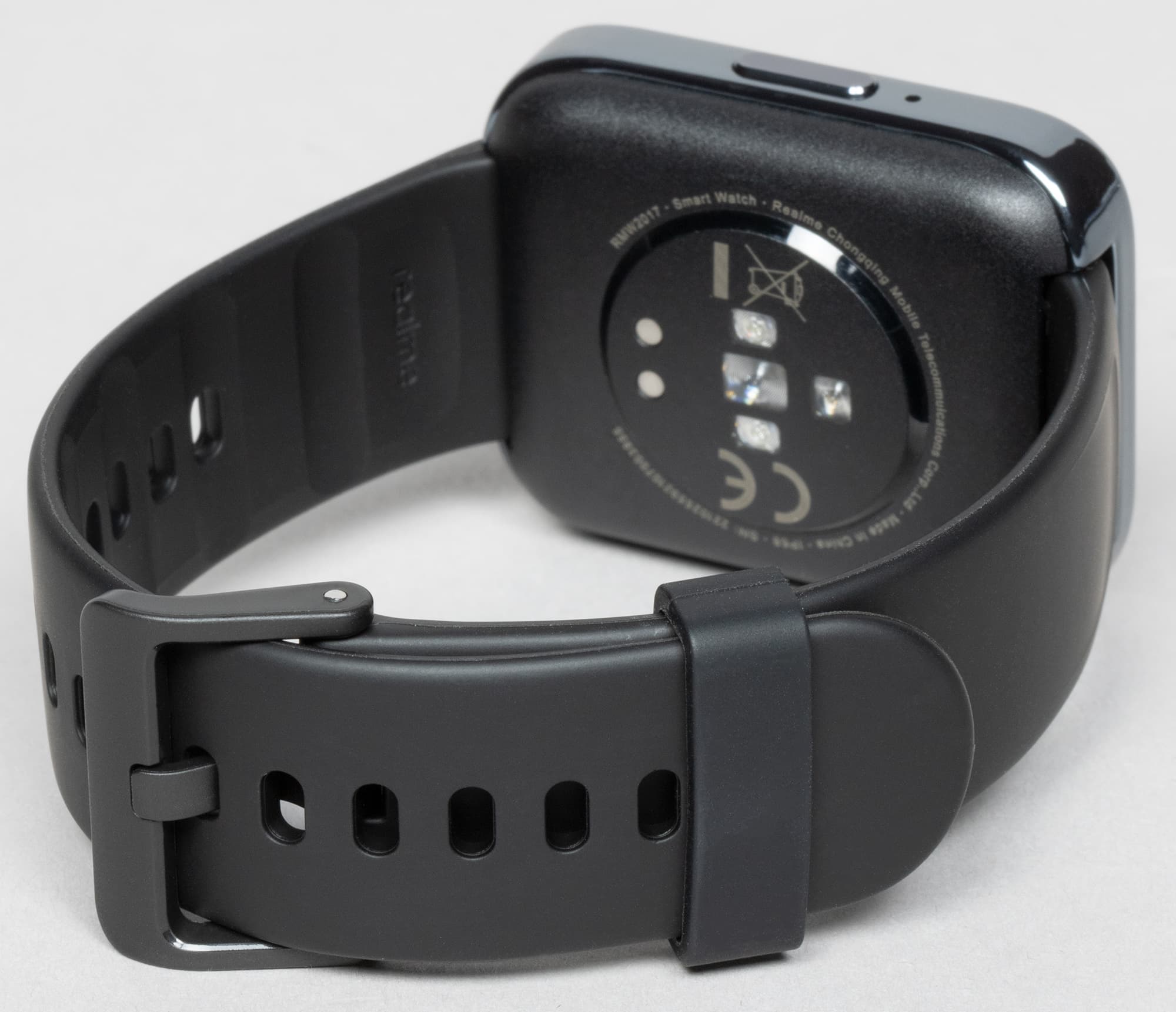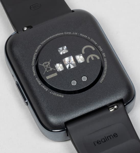 На тыльной стороне никаких сюрпризов: здесь расположены контакты для подключения зарядного устройства и датчики — сердечного ритма и количества кислорода в крови. Крепление половинок ремешка — совершенно стандартное: на спице. Типична и ширина: 22 мм. Поэтому нет никаких проблем купить альтернативный вариант.