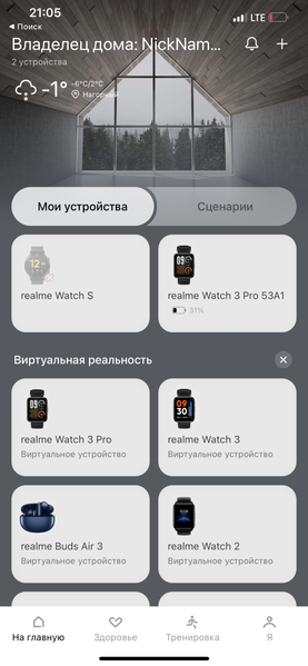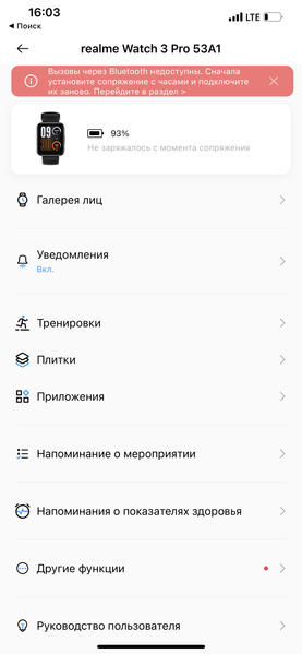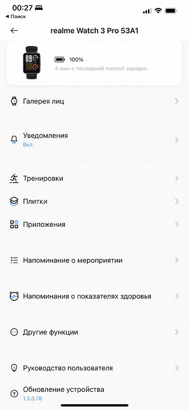 В прошлом году мы отмечали ряд проблем при взаимодействии часов с iPhone. И хотя iOS-приложение всё равно далеко от идеала (в первую очередь это касается корявой русификации), его вполне можно использовать. Главный экран приложения содержит список всех устройств Realme, как текущего, так и прошлых, и вообще никогда не использовавшихся вами. Но нас здесь больше интересует меню внизу и, собственно, плашка нашего устройства. Если нажмем на нее, увидим информацию о модели и настройки.
