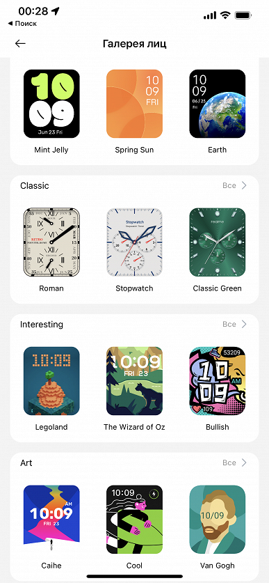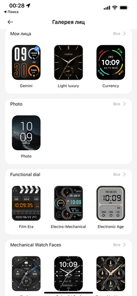 Здесь в общем-то всё понятно, отметим только, что «Галерея лиц» — это как раз пример неудачной русификации, поскольку имеются в виду циферблаты. Здесь можно выбрать из довольно широкого каталога вариант себе по вкусу, а также поставить произвольную фотографию.