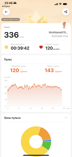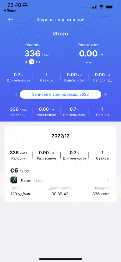 Но отметим, что при тренировках на открытом воздухе необходимо подождать некоторое время (около полуминуты), пока часы поймают сигнал GPS. Если запустить тренировку раньше, то не только маршрут не будет указан, что очевидно, но и скорость часы тоже не определят. Ниже пример результатов лыжной прогулки, начатой до обнаружения GPS. Фактически, часы зафиксировали только пульс и продолжительность тренировки, а также посчитали сброшенные калории. Но никаких других данных они предоставить не смогли.