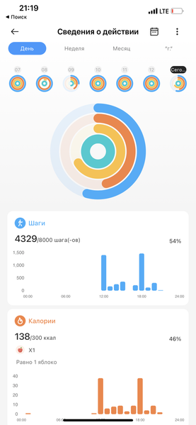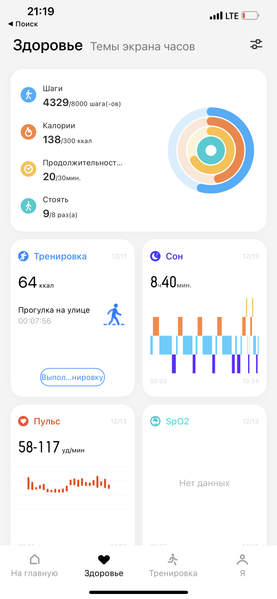 Все показатели наших тренировок находятся на экране »Здоровье» (в него можно перейти из главного меню). Здесь мы видим сводки за день по количеству шагов, сброшенных калорий, продолжительности тренировок и (вот это необычно) количеству вставаний. Вероятно, имеются в виду не вставания как таковые (поскольку их за рабочий день, включающий поездки в транспорте) никак не может быть 9, как на скриншоте ниже), а количество часов, за которые мы вставали хотя бы один раз (или больше).