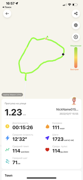 Если же всё сделать как надо, то получим более полную картину. Ниже — результат пешей прогулки. Но отметим одну странность: скорость указывается не в км/ч, а в минутах за километр. В данном случае часы показывают, что 1 км мы проходили в среднем за 12 минут 32 секунды. Исходя из этого легко рассчитать, что скорость была примерно 4,78 км/ч. Но почему само приложение не может выполнить эту простую арифметику?