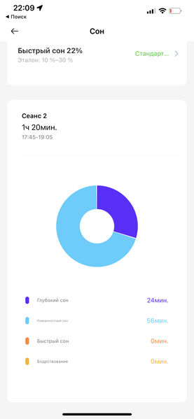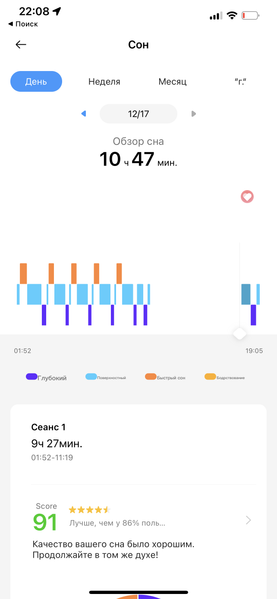 В качестве дополнительного плюса отметим, что часы умеют распознавать дневной сон, что до сих пор проблема для многих умных часов. На скриншотах ниже показан сон за сутки: ночной (около 9 часов) и дневной (еще примерно полтора часа). Дневной обозначен как «сеанс 2» и вполне точно указан по времени.