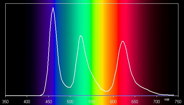 Спектры типичны для OLED — области первичных цветов явно хорошо разделены и имеют вид относительно узких пиков: