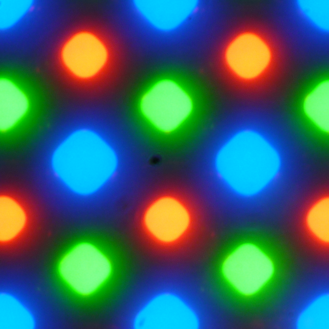 В этом экране используется OLED-матрица — активная матрица на органических светодиодах. Полноцветное изображение создается с помощью субпикселей трех цветов — красного (R), зеленого (G) и синего (B) в равном количестве, что подтверждается фрагментом микрофотографии: