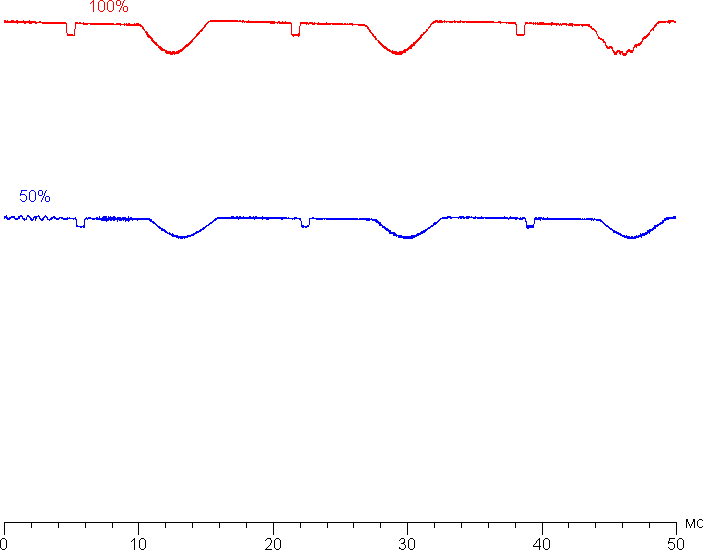 На графике зависимости яркости от времени определяется значимая модуляция с частотой 60 Гц, но мерцание визуально не обнаруживается, так как скважность низкая и фаза модуляции различается по площади экрана. На рисунке ниже приведены зависимости яркости (вертикальная ось) белого поля от времени (горизонтальная ось) для двух значений яркости в режиме фонарика.